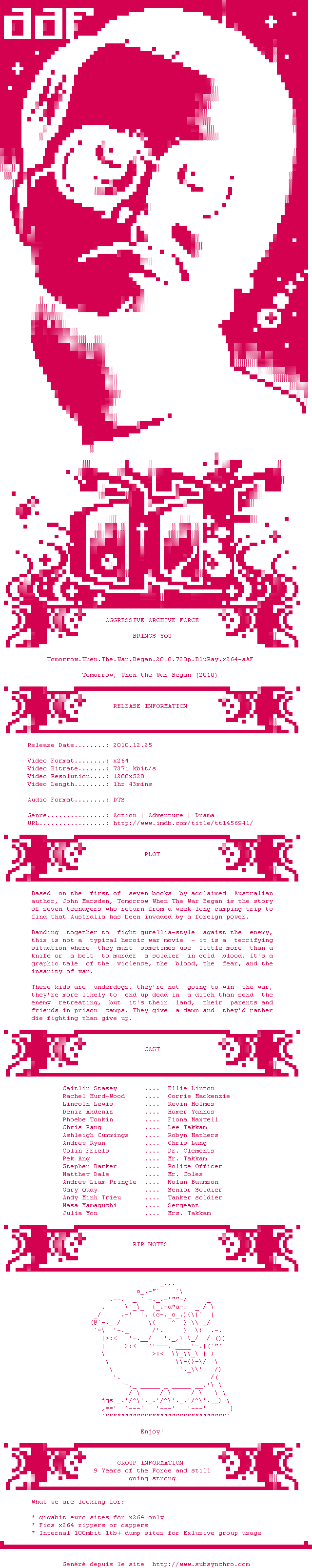 Telechargez le RSS « Fichier de la release Tomorrow.When.The.War.Began.2010.720p.BluRay.x264-aAF »