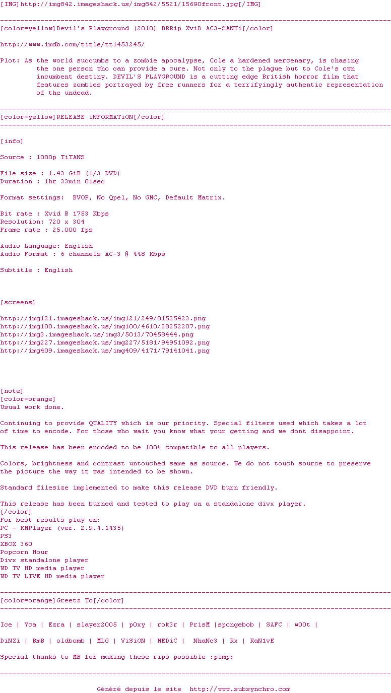 Il n'y a actuellement aucun sous-titre pour cette release. Cliquez ici pour en ajouter un.