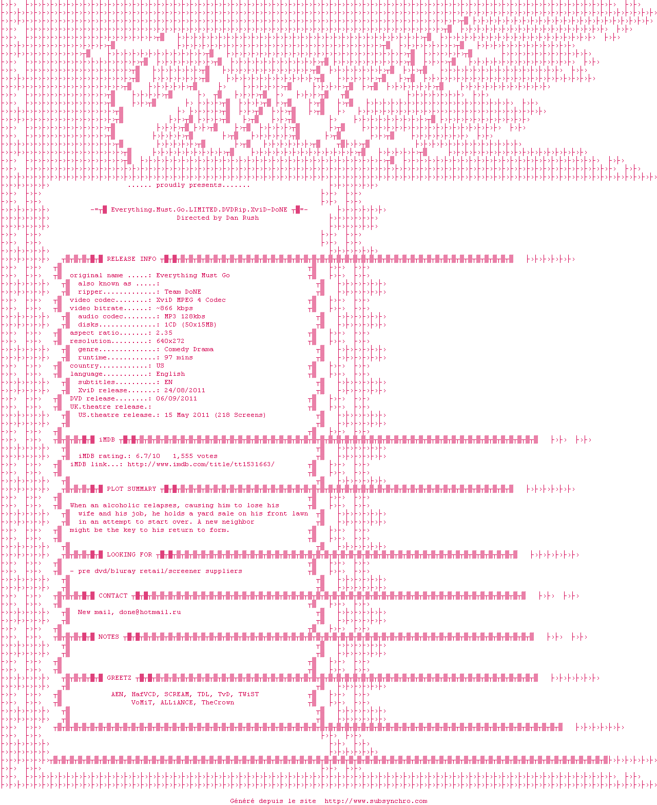 Telechargez le RSS « Fichier de la release Everything.Must.Go.LIMITED.DVDRip.XviD-DoNE »