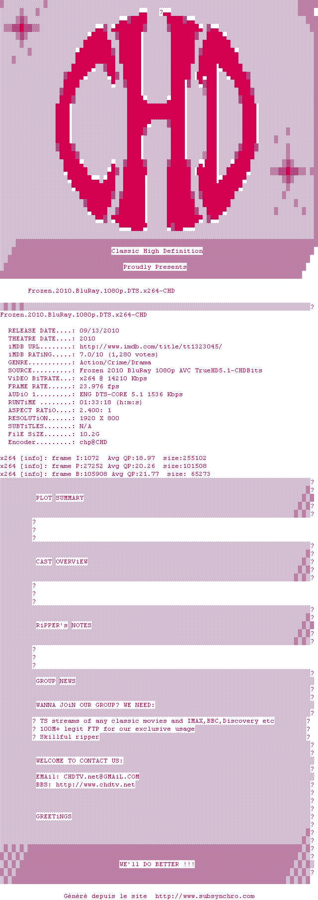Telechargez le RSS « Fichier de la release Frozen.2010.BluRay.1080p.DTS.x264-CHD »