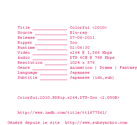 Telechargez le RSS « Fichier de la release Colorful.2010.BDRip.x264.DTS-Zoo »