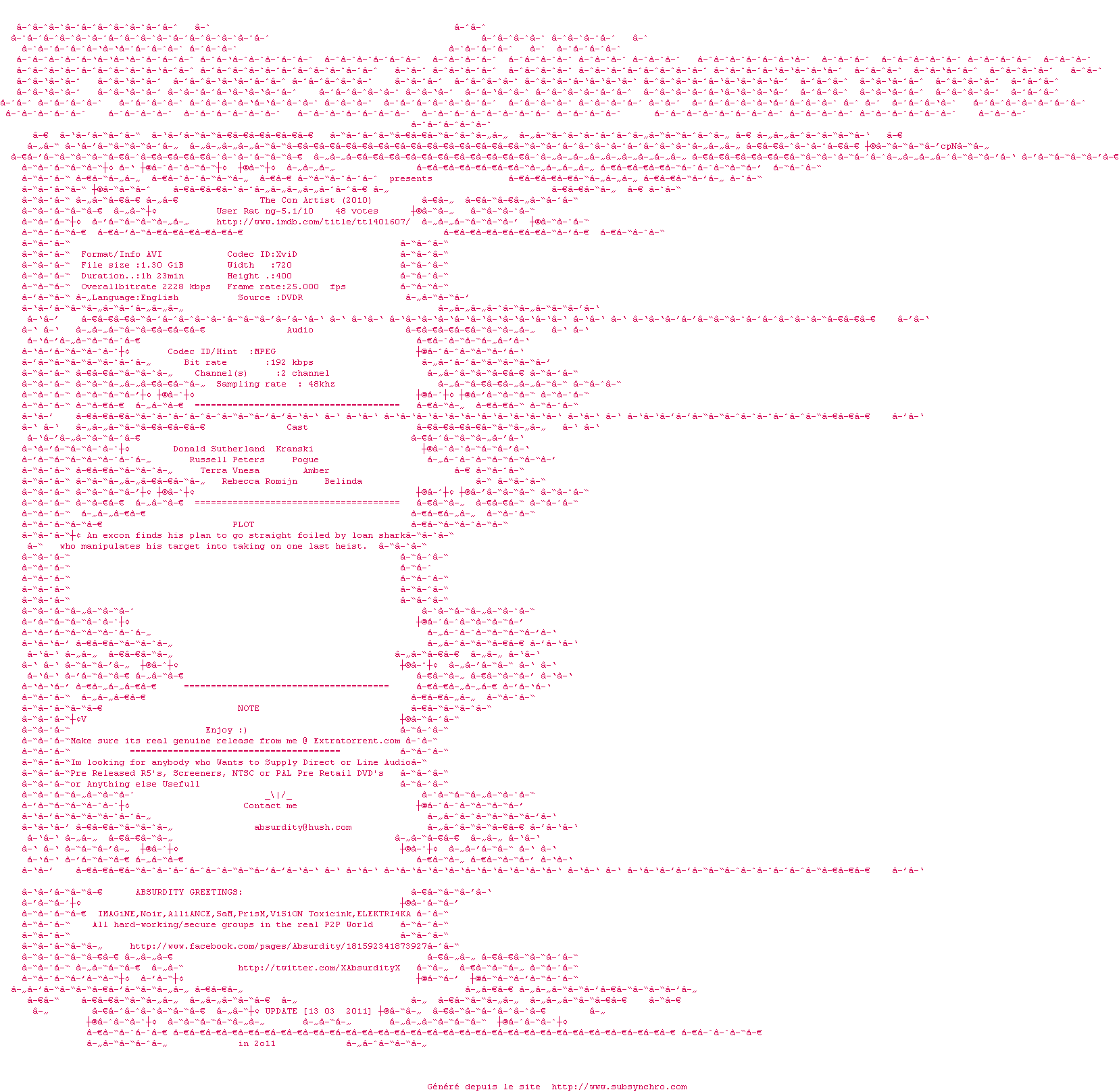 Telechargez le RSS « Fichier de la release The.Con.Artist.2010.DvDRiP.XviD-AbSurdiTy »