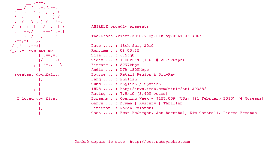 Telechargez le RSS « Fichier de la release The.Ghost.Writer.2010.720p.BluRay.X264-AMIABLE »