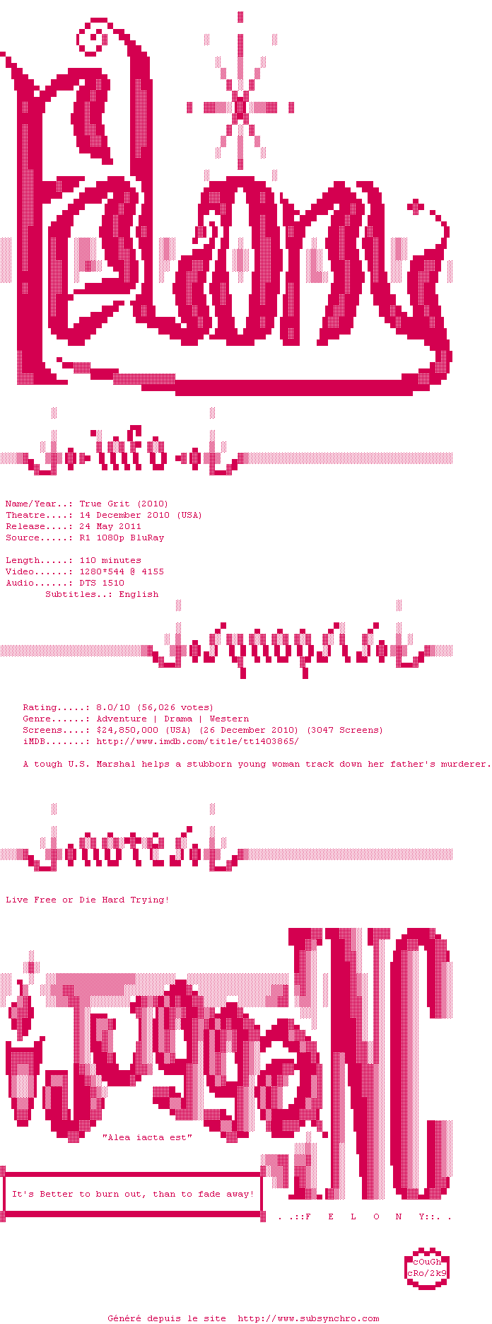 Telechargez le RSS « Fichier de la release True.Grit.2010.720p.BluRay.x264-Felony »