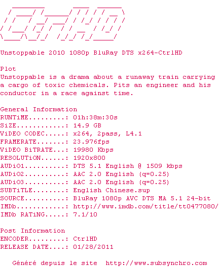 Telechargez le RSS « Fichier de la release Unstoppable.2010.1080p.BluRay.DTS.x264-CtrlHD »