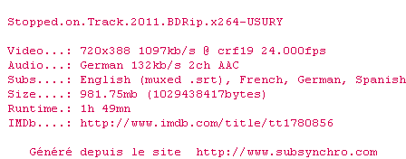 Voir le nfo de la release Stopped.on.Track.2011.1080p.BluRay.x264-USURY