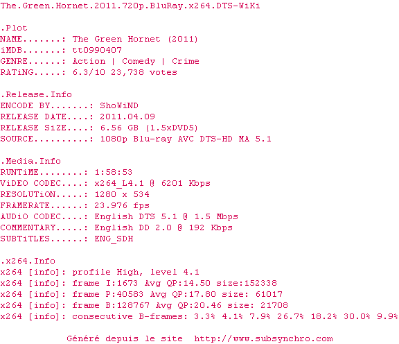 Voir le nfo de la release The.Green.Hornet.2011.720p.BluRay.x264.DTS-WiKi