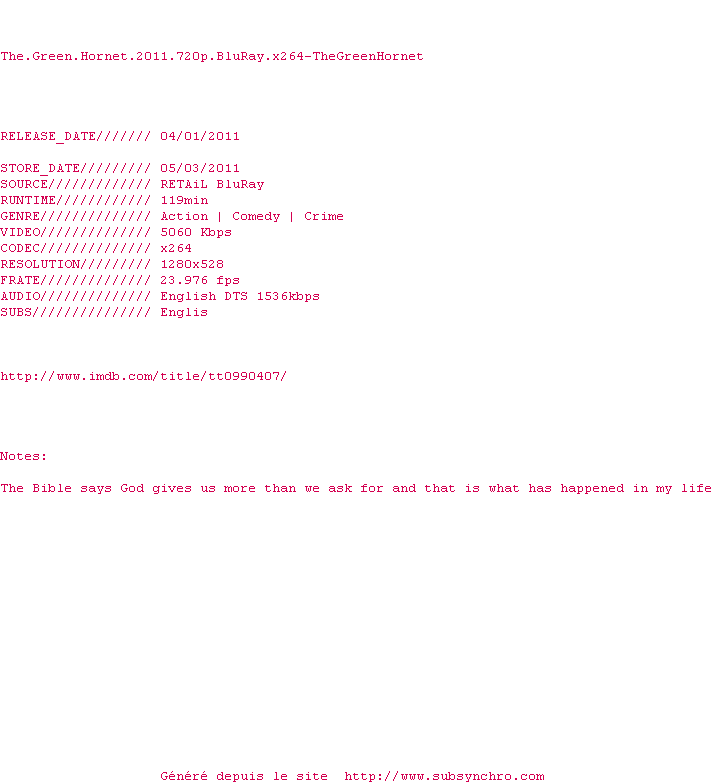 Voir le nfo de la release The.Green.Hornet.2011.720p.BluRay.x264-TheGreenHornet