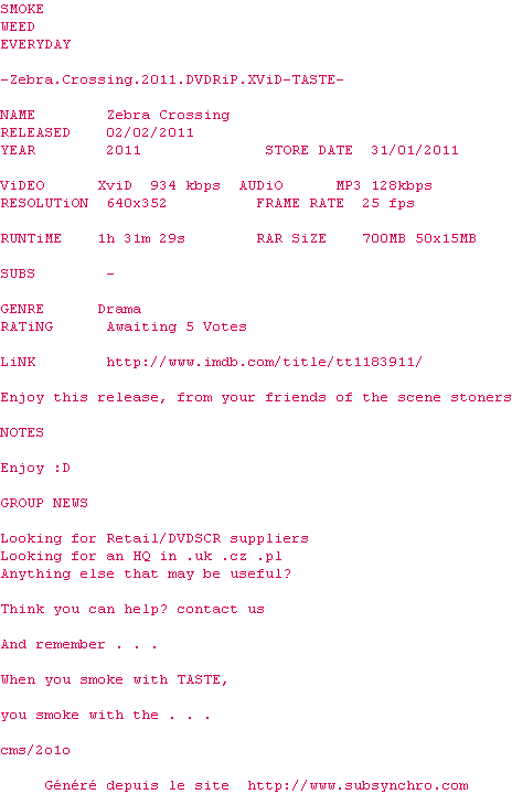 Voir le nfo de la release Zebra.Crossing.2011.DVDRiP.XViD-TASTE