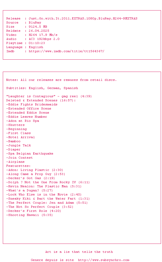 Voir le nfo de la release Just.Go.With.It.2011.EXTRAS.1080p.BluRay.H264-RMXTRAS