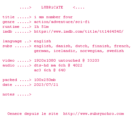 Voir le nfo de la release I.Am.Number.Four.2011.1080p.BluRay.H264-LUBRiCATE