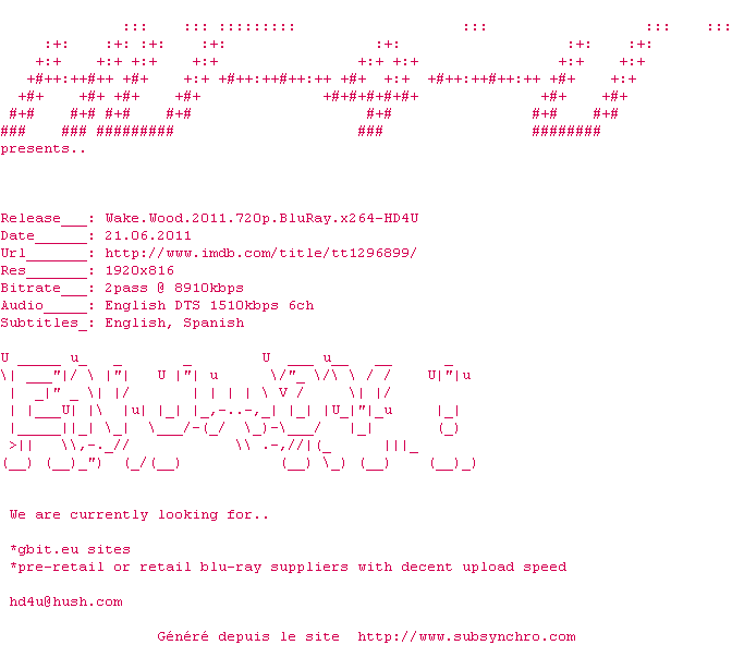 Voir le nfo de la release Wake.Wood.2011.1080p.BluRay.x264-HD4U