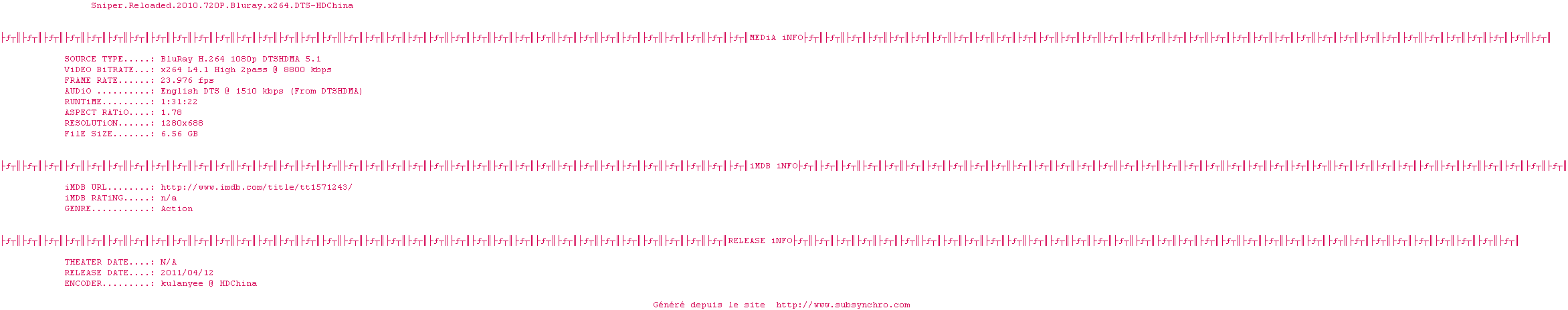 Voir le nfo de la release Sniper.Reloaded.2010.720P.Bluray.x264.DTS-HDChina