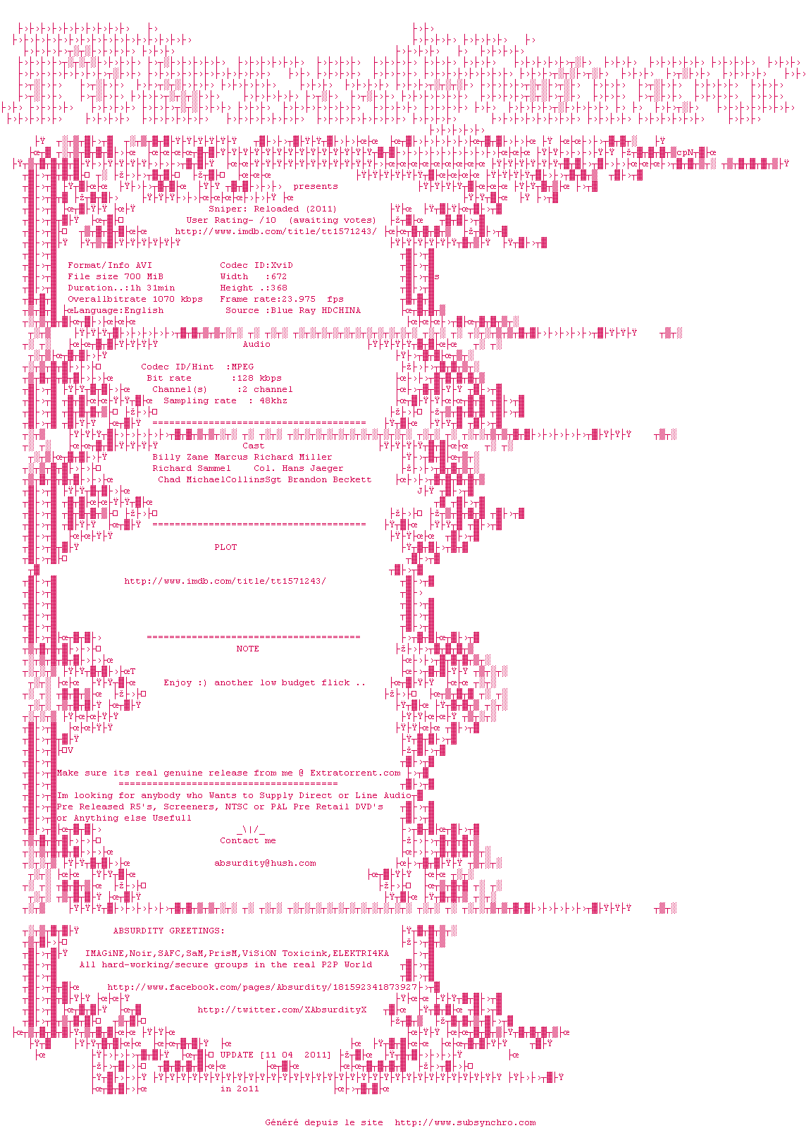 Voir le nfo de la release Sniper.Reloaded.2011.BRRiP.XviD-AbSurdiTy