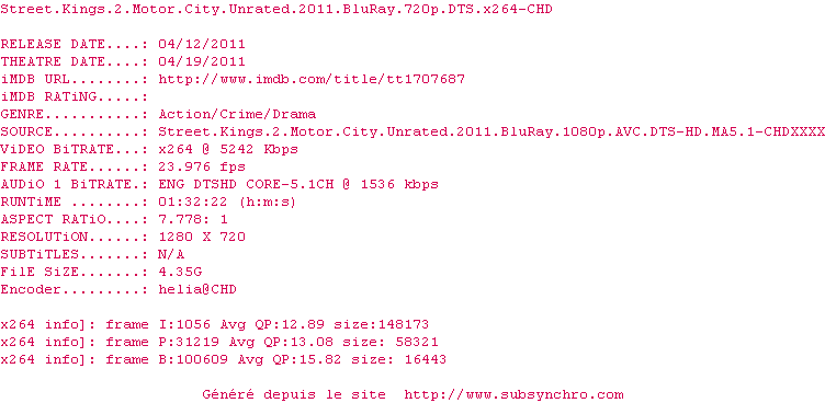Voir le nfo de la release Street.Kings.2.Motor.City.Unrated.2011.BluRay.720p.DTS.x264-CHD