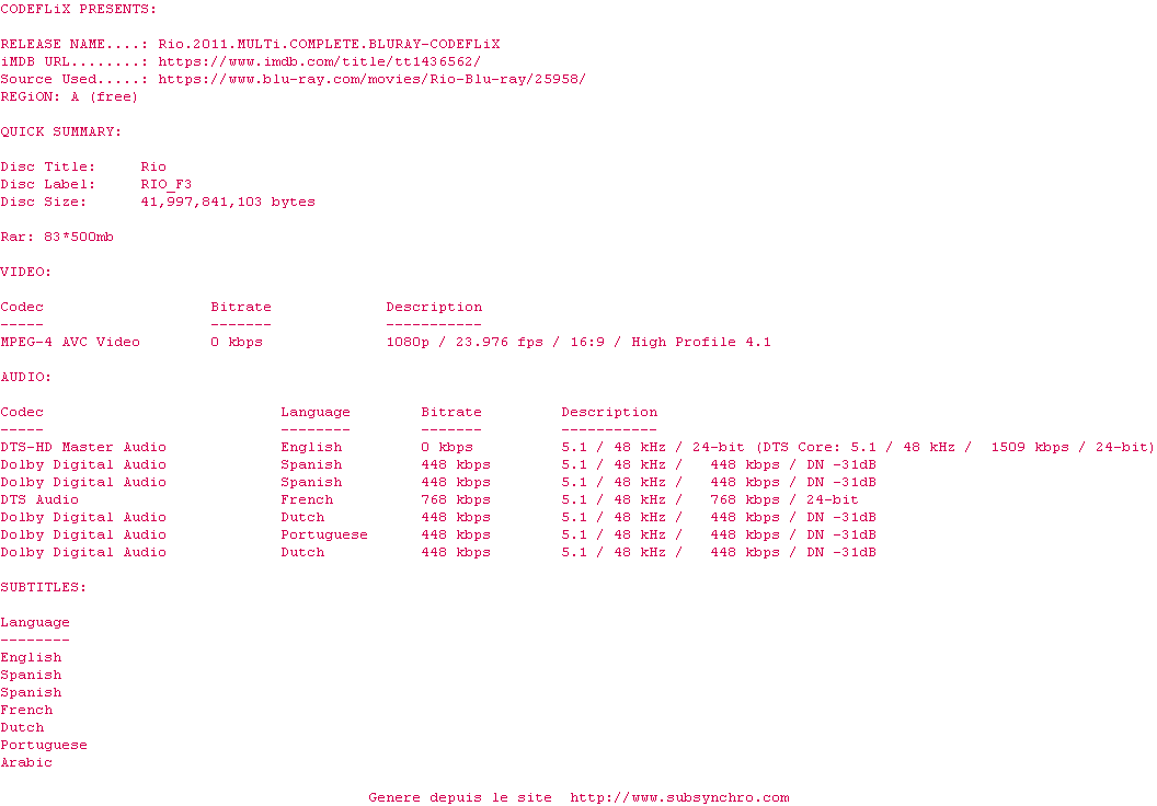 Y avez-vous pense ? Nous proposons déjà 1999 sous-titres pour le film Rio. Avez-vous essaye de voir si ces sous-titres etaient compatibles avec cette release ? On vous laisse le soin de tester cela pour nous et de contribuer au site en postant le sous-titre en cas de compatiblite constatee !