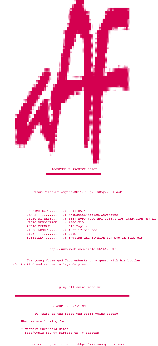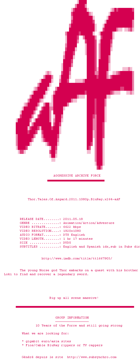 Voir le nfo de la release Thor.Tales.Of.Asgard.2011.1080p.BluRay.x264-aAF