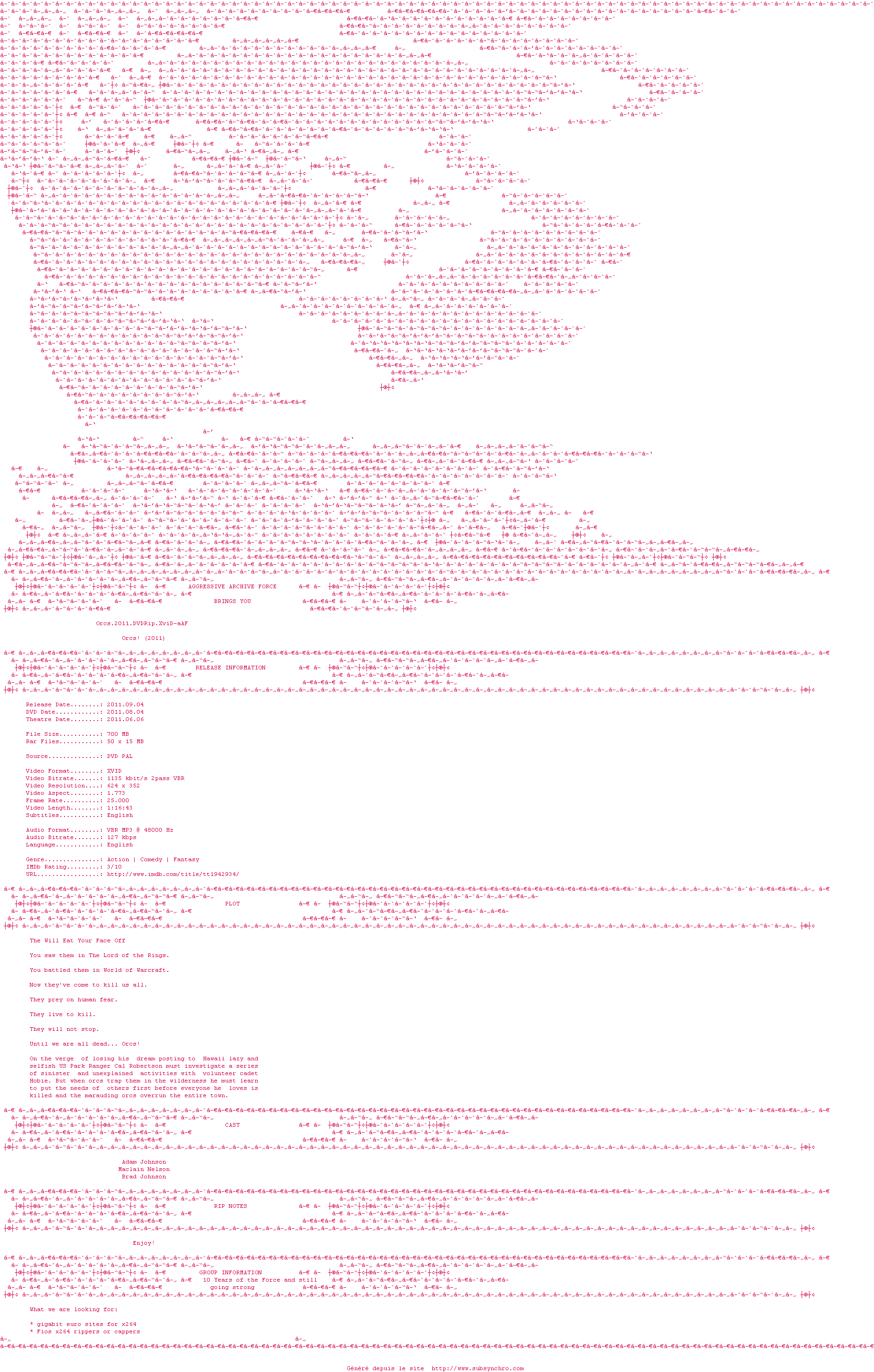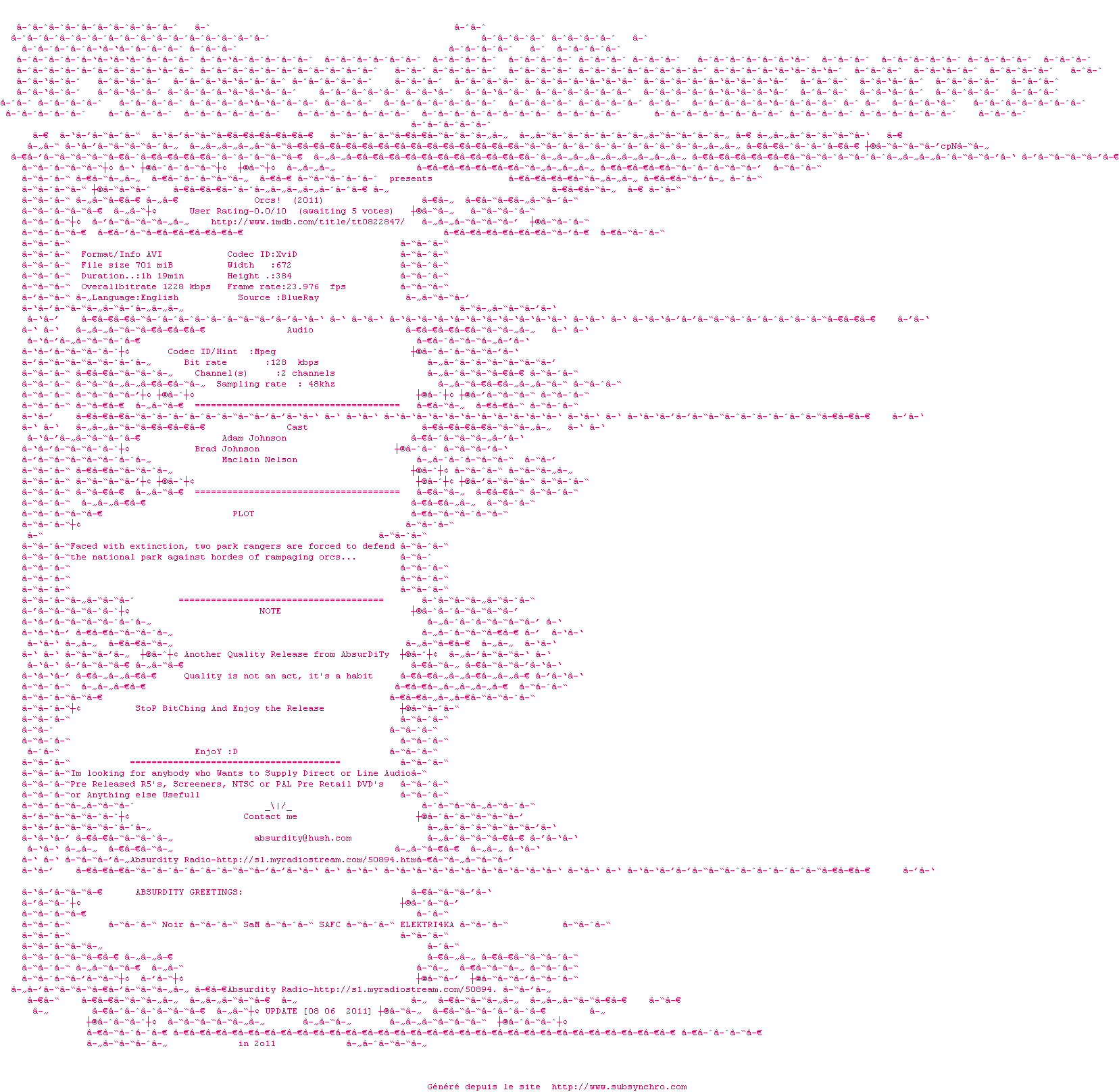 | Voir le nfo de la release Orcs.2011.BRRiP.XviD-AbSurdiTy | AbSurdiTy | Orcs.2011.BRRiP.XviD-AbSurdiTy OpenSubtitles | 0 fichier |