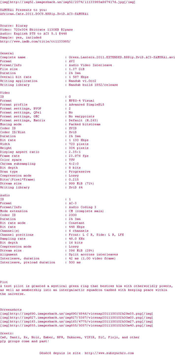 Voir le nfo de la release Green.Lantern.2011.EXTENDED.BRRip.XviD.AC3-SAMURAi