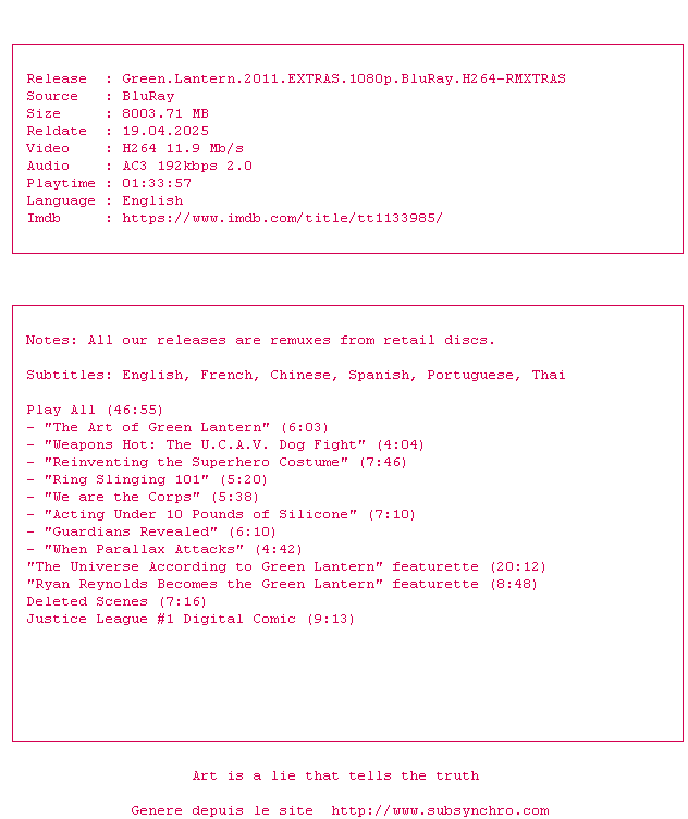 Voir le nfo de la release Green.Lantern.2011.EXTRAS.1080p.BluRay.H264-RMXTRAS