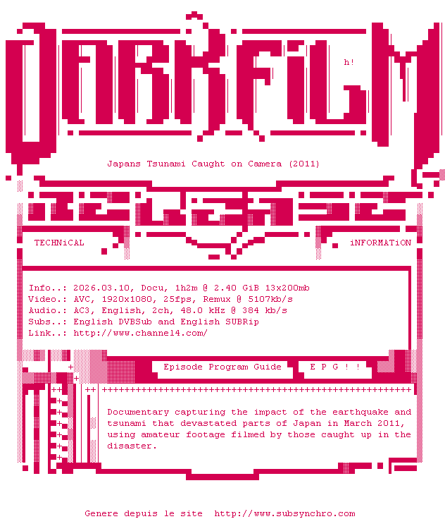 Telechargez le RSS « Fichier de la release Japans.Tsunami.Caught.On.Camera.2011.1080p.HDTV.H264-DARKFLiX »