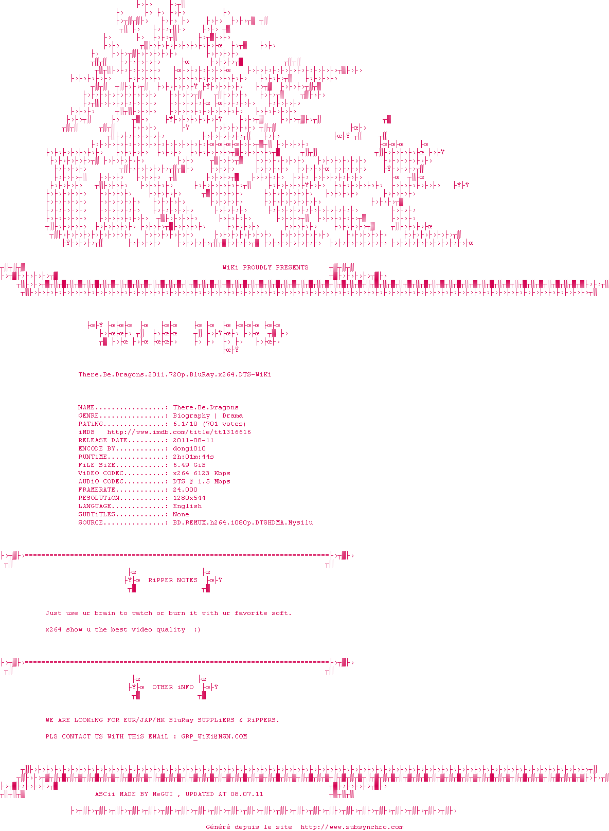 Voir le nfo de la release There.Be.Dragons.2011.720p.BluRay.x264.DTS-WiKi