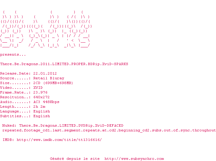 Voir le nfo de la release There.Be.Dragons.2011.LIMITED.PROPER.BDRip.XviD-SPARKS