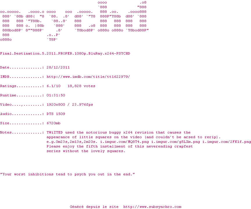 Voir le nfo de la release Final.Destination.5.2011.PROPER.1080p.BluRay.x264-PSYCHD