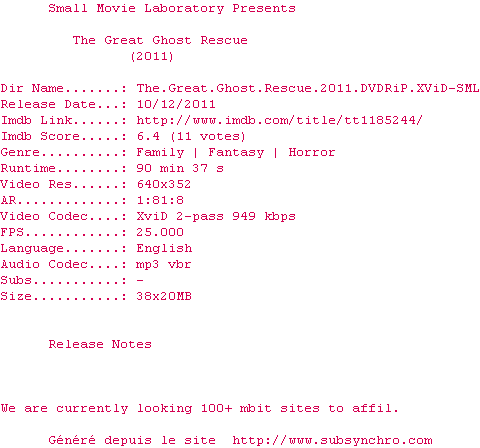 | Voir le nfo de la release The.Great.Ghost.Rescue.2011.DVDRiP.XViD-SML | SML | The.Great.Ghost.Rescue.2011.DVDRiP.XViD-SML OpenSubtitles | 0 fichier | ||