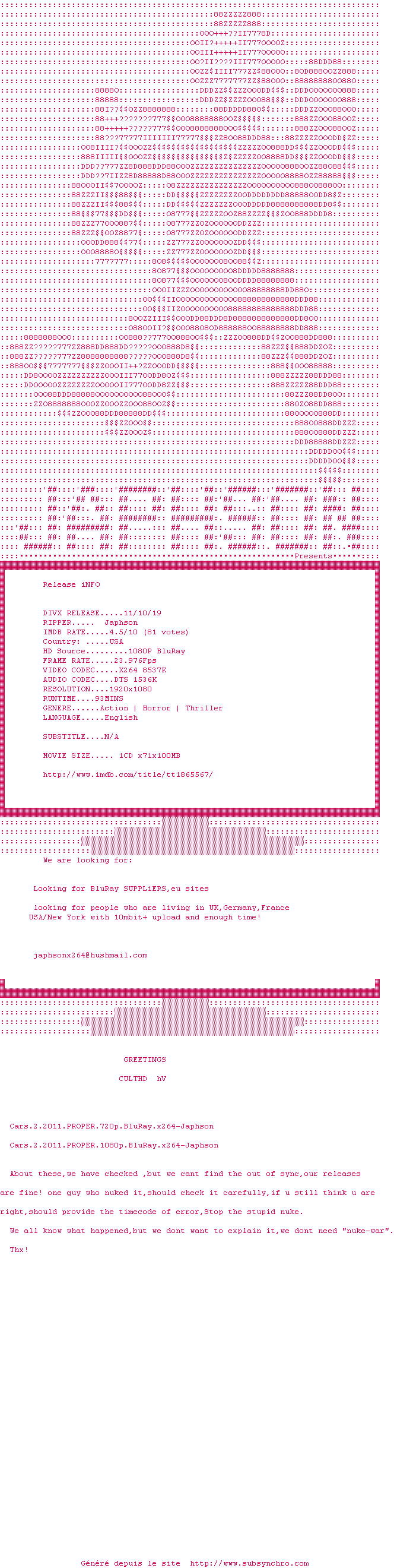Voir le nfo de la release Wrong.Turn.4.2011.1080p.BluRay.x264-Japhson