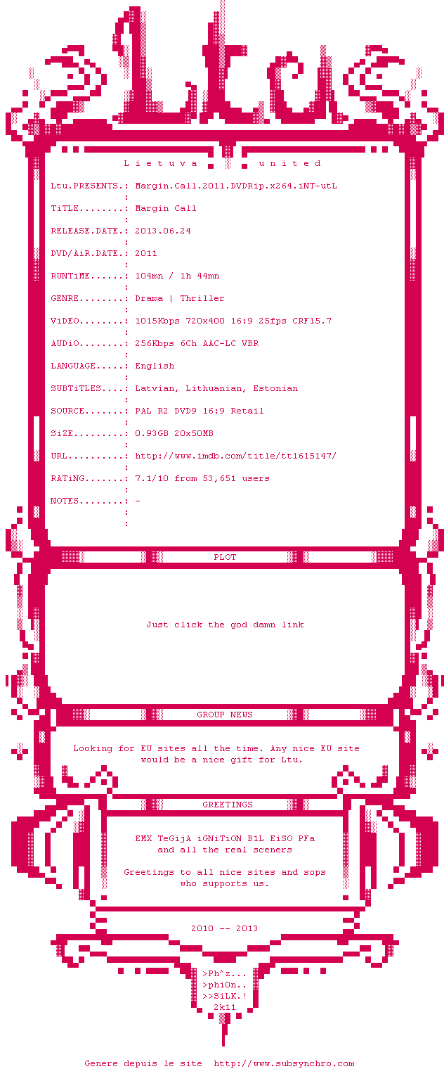 Y avez-vous pense ? Nous proposons déjà 1839 sous-titres pour le film Margin Call. Avez-vous essaye de voir si ces sous-titres etaient compatibles avec cette release ? On vous laisse le soin de tester cela pour nous et de contribuer au site en postant le sous-titre en cas de compatiblite constatee !