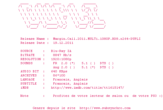 Y avez-vous pense ? Nous proposons déjà 1839 sous-titres pour le film Margin Call. Avez-vous essaye de voir si ces sous-titres etaient compatibles avec cette release ? On vous laisse le soin de tester cela pour nous et de contribuer au site en postant le sous-titre en cas de compatiblite constatee !