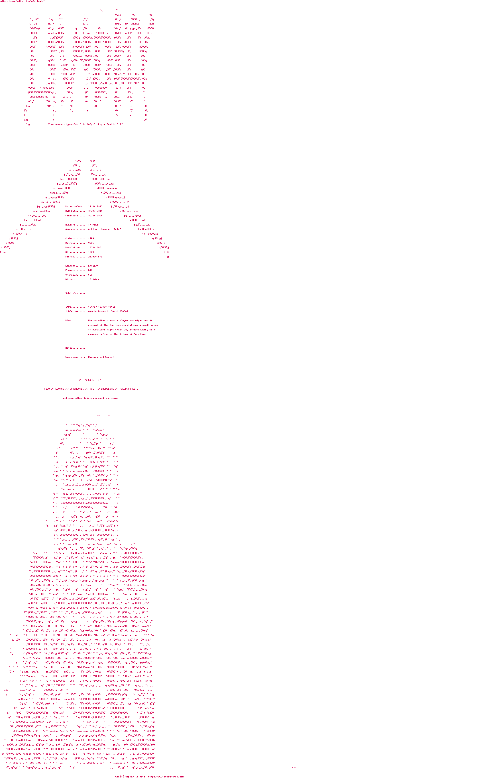 Voir le nfo de la release Zombie.Apocalypse.DC.2011.1080p.BluRay.x264-LiViDiTY