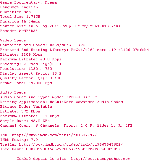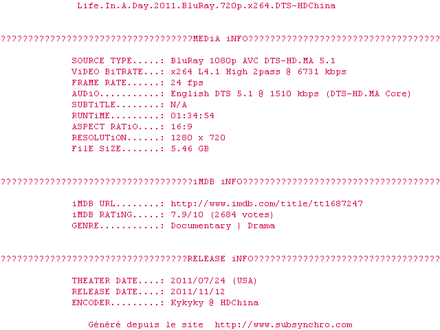 Voir le nfo de la release Life.In.A.Day.2011.BluRay.720p.x264.DTS-HDChina