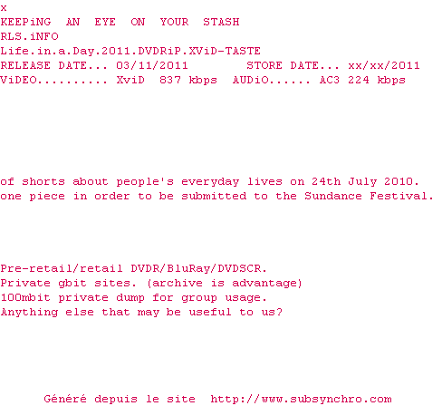 Voir le nfo de la release Life.in.a.Day.2011.DVDRiP.XViD-TASTE