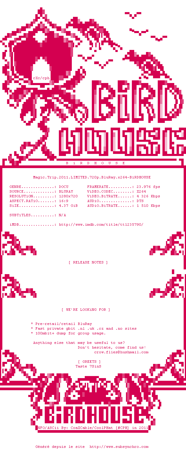 Voir le nfo de la release Magic.Trip.2011.LIMITED.720p.BluRay.x264-BiRDHOUSE