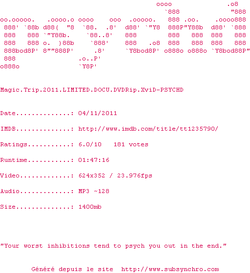 Voir le nfo de la release Magic.Trip.2011.LIMITED.DOCU.DVDRip.XviD-PSYCHD