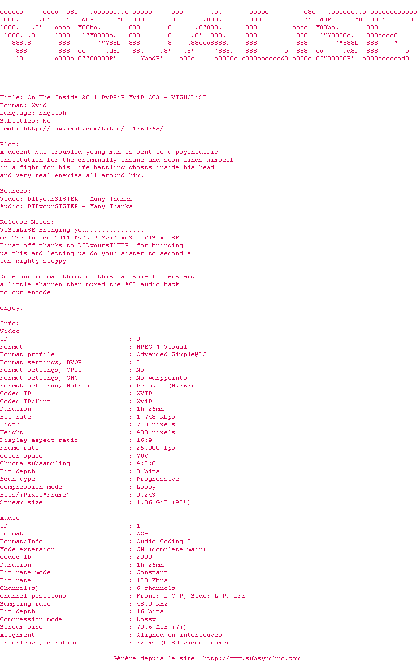 Voir le nfo de la release On.The.Inside.2011.DvDRiP.XviD.AC3-VISUALiSE