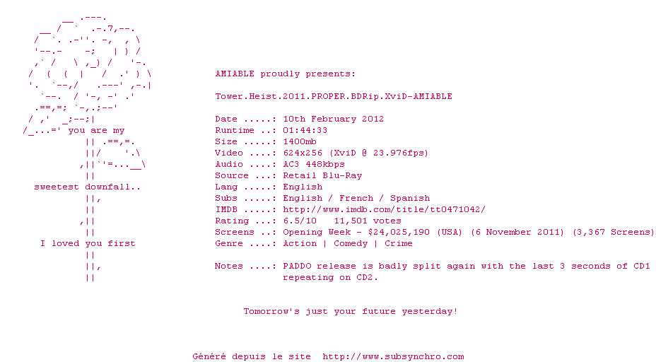 Le commentaire de SubSynchro Commente par SubSynchro (539), Le Mardi 21 Fevrier 2012 à 16h06 Le scénario est bien ficellé et c'est agréable de voir Ben Stiller, et Eddie Murphy dans autre chose qu'une comédie débile. Bref, ca passe vite malgré quelques incohérences. 8 / 10 1 0