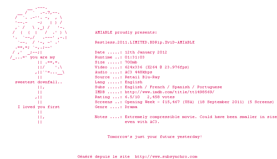 Voir le nfo de la release Restless.2011.LIMITED.720p.BluRay.X264-AMIABLE