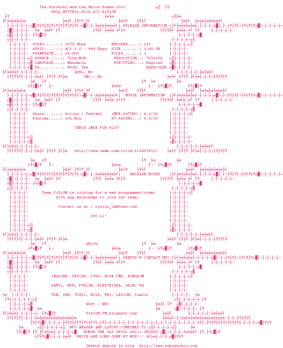 Voir le nfo de la release The.Sorcerer.And.The.White.Snake.2011.720p.BDRip.XviD.AC3-ViSiON