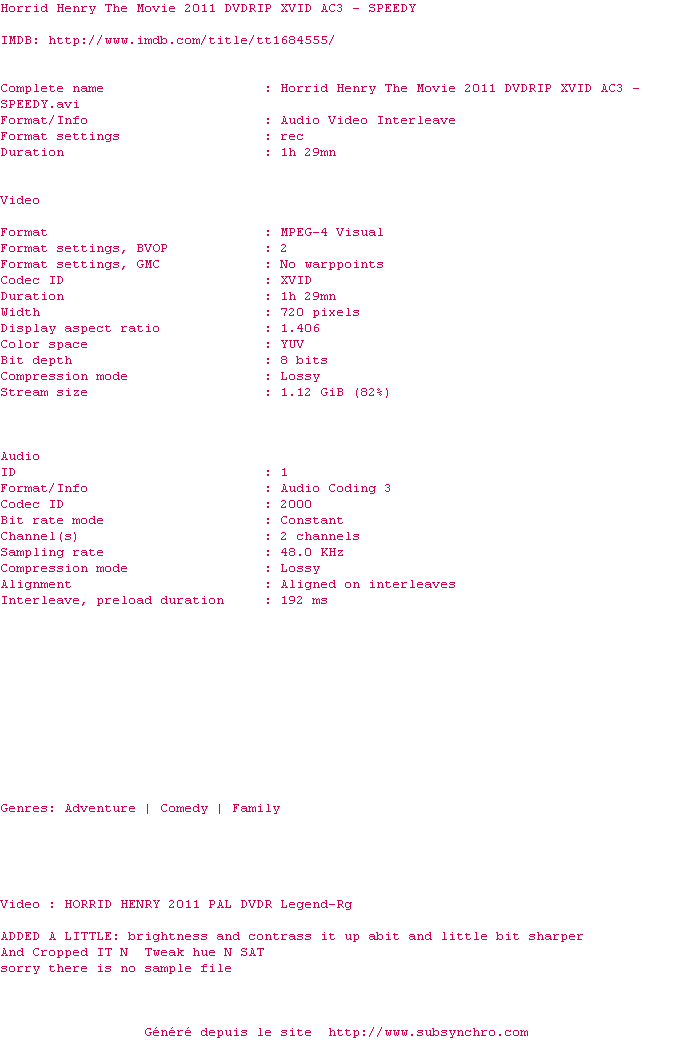 Voir le nfo de la release Horrid.Henry.The.Movie.2011.DVDRIP.XVID.AC3-SPEEDY
