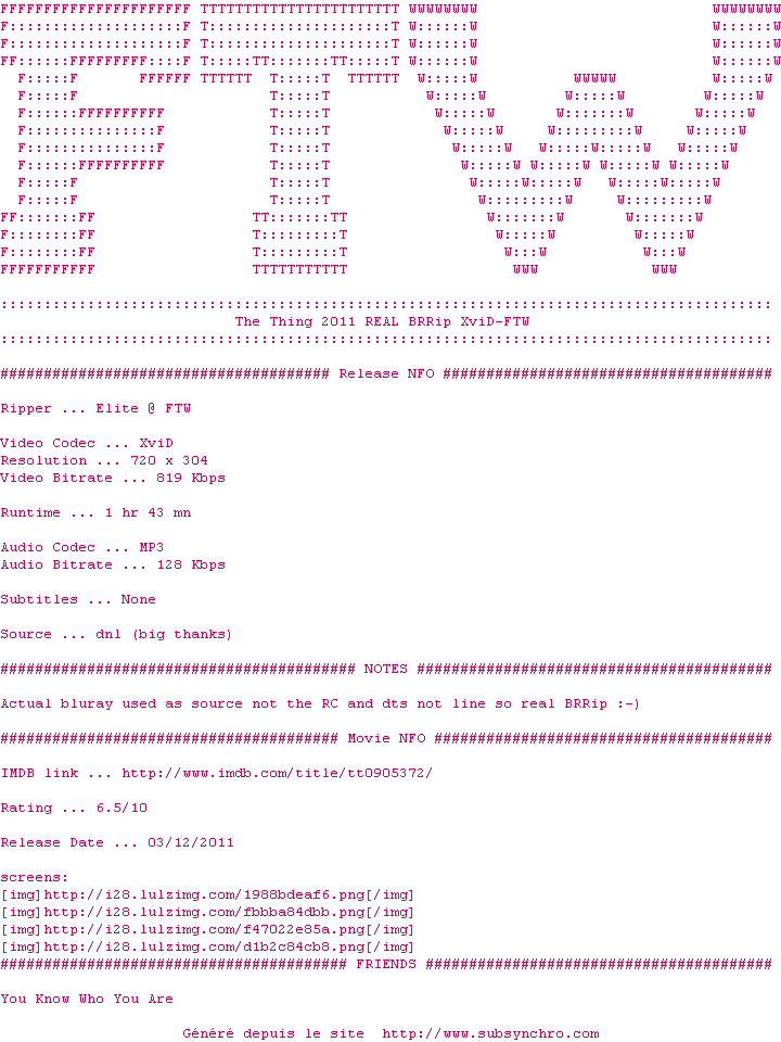Voir le nfo de la release The.Thing.2011.BRRip.XviD-FTW