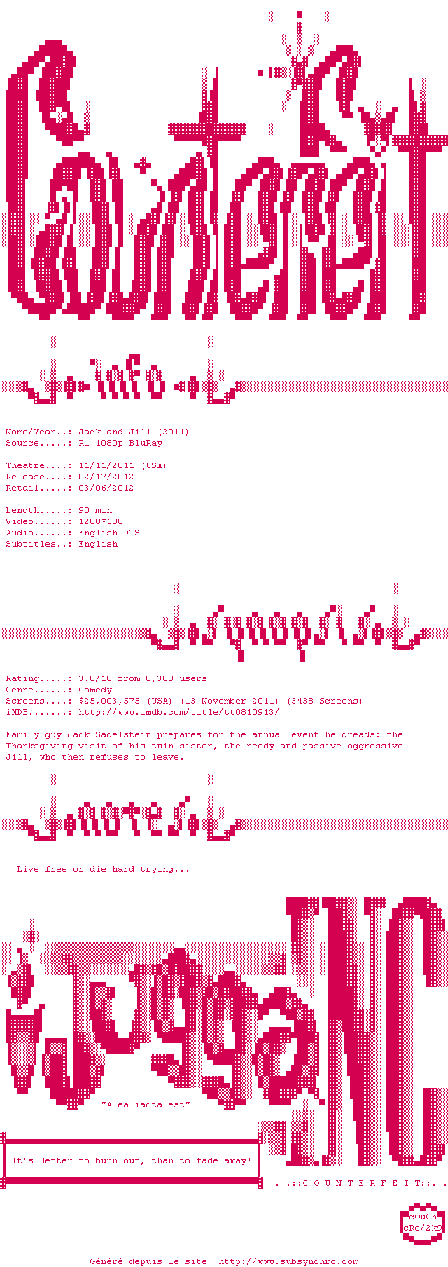 | Counterfeit | Jack.and.Jill.2011.BDRip.XviD-Counterfeit OpenSubtitles | 0 fichier | |||