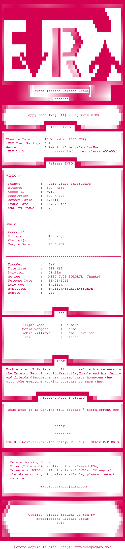 | COCAIN | Happy.Feet.Two.2011.DVDRip.XviD-COCAIN OpenSubtitles | 0 fichier | |||