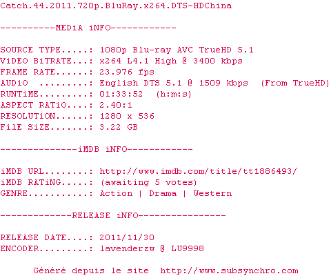 Voir le nfo de la release Catch.44.2011.720p.Bluray.x264.DTS-HDChina