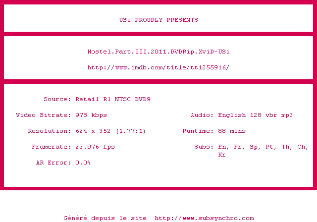 Voir le nfo de la release Hostel.Part.III.2011.DVDRip.XviD-USi