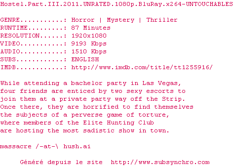 Voir le nfo de la release Hostel.Part.III.2011.UNRATED.1080p.BluRay.x264-UNTOUCHABLES