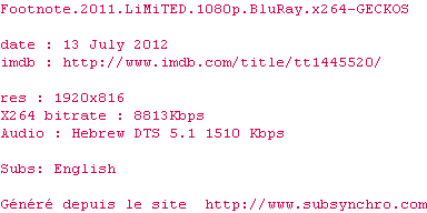 Voir le nfo de la release Footnote.2011.LiMiTED.1080p.BluRay.x264-GECKOS