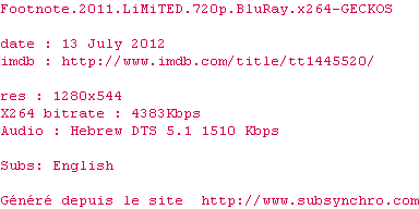 Voir le nfo de la release Footnote.2011.LiMiTED.720p.BluRay.x264-GECKOS